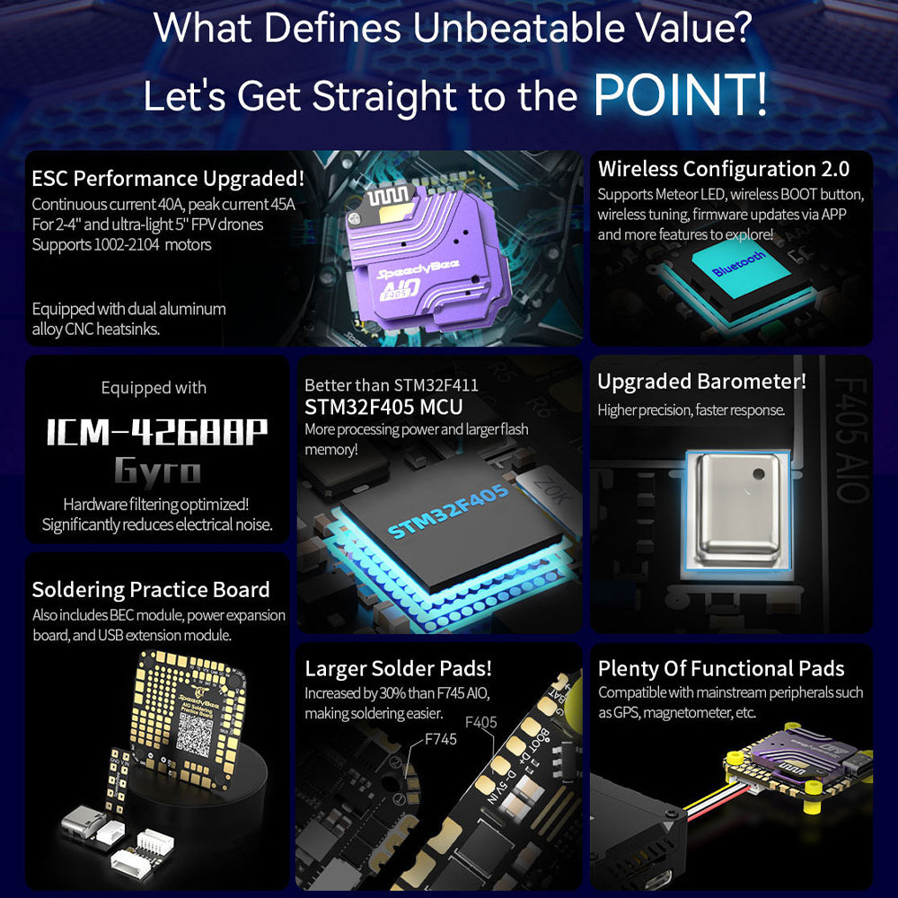 The SpeedyBee F405 AIO 40A is a powerful all-in-one flight controller and ESC solution built for compact FPV drones. Designed for 2–4” and ultralight 5” builds, it features a clean ICM-42688P gyro, upgraded 40A ESC performance, and full Wireless Configuration 2.0 via the SpeedyBee App — allowing wireless tuning, wireless BOOT, and firmware updates without touching a button.