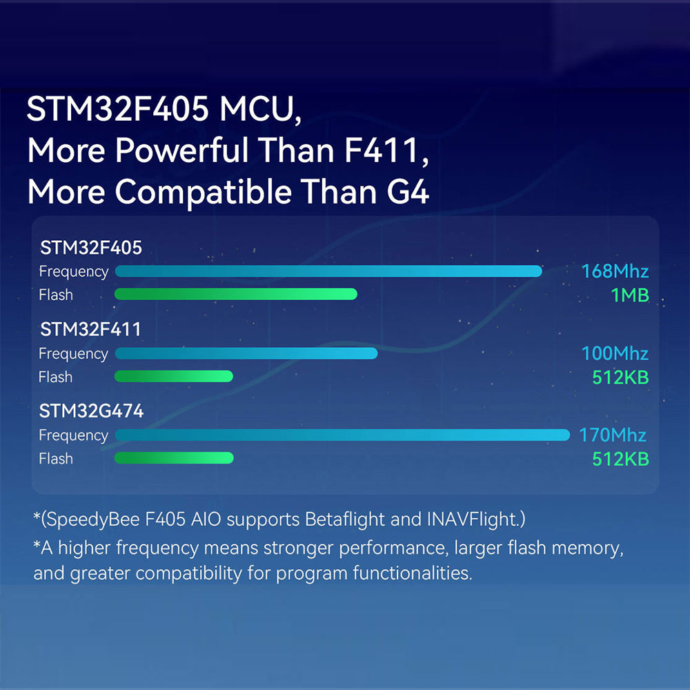 - STM32F405 MCU – fast, reliable F4 processing